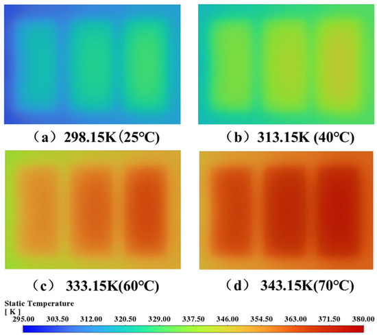 Figure 22 shows the steady-state temperature distributions on the top surface of the cooling plate for different inlet coolant temperatures. To ensure a fair visual comparison, all contour plots are presented using the same color scale. As the inlet temperature increases from 298.15 K to 343.15 K, the overall temperature field shifts upward, and the absolute temperature levels rise across the entire surface. Localized high-temperature regions can be observed in each case, with their positions remaining consistent, while the size and intensity of these regions increase in line with the overall temperature elevation.
