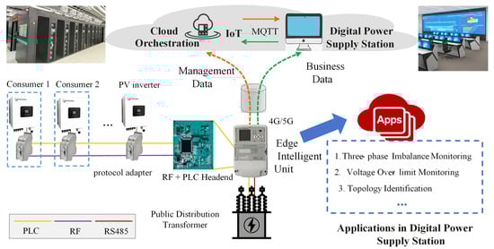 (4) Large-scale demonstration construction based on digital power supply stations of LVDA. To implement large-scale demonstrations of digital twin LVDA, digital power supply stations are being constructed. As the most fundamental unit of the power grid, power supply stations handle critical tasks, such as fault repair and equipment inspection, and create rich application scenarios for the LVDA digital twin. However, the fragmented professional systems within these digital power supply stations lack a centralized management platform and intelligent support tools. The architecture of the substation digital power supply station is illustrated in Figure 3. The photovoltaic inverters, smart switches, and other facilities of different consumers can achieve information exchange with the edge intelligent units through their respective protocol adapters. Protocol converters typically use radio frequency (RF) communication and power line carrier communication (PLC) to achieve the conversion between different communication protocols. The edge intelligent unit acquires the global status information of the LVDA by interacting with the protocol adapters of different users, laying the foundation for further regulation of the LVDA.