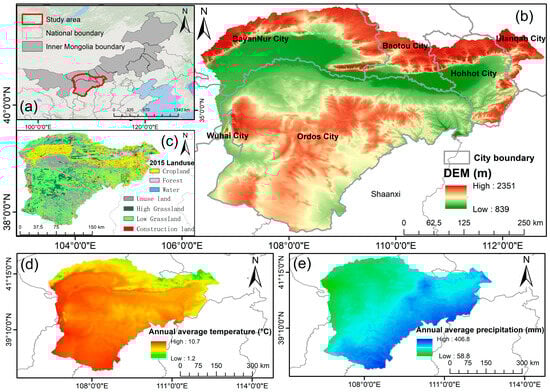 Location and natural conditions of the study area. (a) Geographical location of the Inner Mongolia Yellow River Basin. (b) Digital Elevation Model (DEM, m). (c) Map of land use types in 2015. (d) Mean annual temperature in 2023 (°C). (e) Annual precipitation in 2023 (mm).
