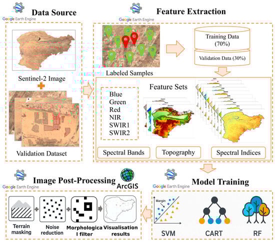 After selecting the optima classifier, the preliminary classification results were further refined through the following post-processing steps to enhance the precision of PV extraction: Firstly, the DEM data were imported into the GEE platform to calculate slope and mountain shadow, and areas with a slope > 30% and mountain shadow < 150 were excluded, mainly referring to Lyu et al. []. Secondly, the classification output was binarized, and a focal minimum filter with a 1-pixel neighborhood window was applied to remove isolated PV pixels (those with fewer than 9 neighboring pixels), effectively mitigating salt-and-pepper noise []. A focal maximum filter was subsequently employed to reconnect fragmented PV patches. To further refine the results, a focal mode filter with a 1-pixel neighborhood was used to smooth boundaries and fill internal gaps. The final classification results were vectorized and imported into ArcGIS 10.2, where manual inspection using Sentinel-2 composite imagery was conducted to eliminate incorrectly classified PV polygons []. The overall technical workflow is presented in Figure 2.