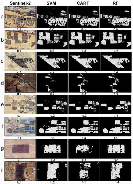 Sentinel-2 imagery and extraction results using SVM, CART, and RF classifiers. Each row (a–h) represents one PV station, with four panels: “.1” Sentinel-2 imagery, “.2” SVM extraction result, “.3” CART extraction result, and “.4” RF extraction result (e.g., a.1–a.4 for station a, b.1–b.4 for station b, etc.).