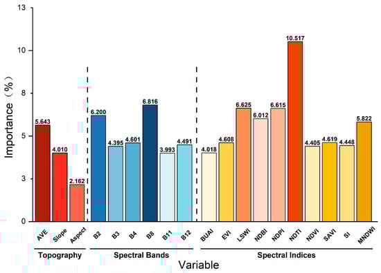 After identifying the optimal classifier, the RF classifier was used to evaluate the influence of each variable on the model performance. A total of 19 variables across three categories contributed to PV extraction in the study area (Figure 4). Among these, NDTI had the highest contribution to PV extraction, with an importance value of 10.517%. This was followed by B8 (6.816%), LSWI (6.625%), NDPI (6.615%), B2 (6.200%), and NDBI (6.012%). Variables such as MNDWI, AVE, SAVI, EVI, B4, B12, SI, NDVI, B3, BUAI, slope, and B11 had importance values ranging from 4% to 6%. Aspect had the lowest importance, accounting for only 2.162%. Overall, spectral indices had the most significant influence on PV extraction in the study area. The importance rankings of NDTI, LSWI, NDPI, NDBI, and MNDWI were 1st, 3rd, 4th, 6th, and 7th, respectively. In terms of spectral bands, the importance ranking of variables for PV extraction was B8, B2, B4, B12, B3, and B11. The three topographic variables had varying degrees of influence on PV extraction.