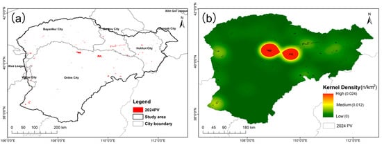 According to the extraction results generated by the RF classifier (Figure 5a), the spatial distribution of PV stations in the study area in 2024 generally exhibited an “overall dispersion with local clustering” pattern, with concentrations primarily in the northern and western parts of the region—particularly in Bayannur, Baotou, Hohhot, and Ordos. Kernel density analysis further revealed the core areas of PV development (Figure 5b). Overall, four high-density clusters of PV stations were identified, primarily located in the northern and southwestern parts of the study area. These clusters exhibited significantly higher spatial density values compared to other regions, indicating that they represent hotspots of PV development.