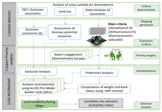 This study contributes to advancing GIS-based MCDM methodologies by introducing an automated, scalable geospatial decision-support framework for community-scale biomass power plant (CSBPP) site selection. The study presents a novel integration of spatial-based MCDM and AHP in a pairwise comparison matrix within a GIS environment using the ModelBuilder tool in ArcGIS Pro [18]. This enables structured and reproducible decision analysis while improving model transparency and efficiency. The participatory weighting approach, which incorporates diverse expert inputs from stakeholders involved in bioenergy planning within Thailand’s Eastern Economic Corridor (EEC) to prioritize key criteria and assign weights for community-scale biomass power plants (CSBPPs), enhances the robustness, credibility, and contextual relevance of the weights assigned to the evaluation criteria. By embedding the decision model into an automated ModelBuilder framework, the proposed method significantly enhances the processing speed and scalability, making it suitable for high-resolution spatial analysis (100-m grid) and large-scale applications. The proposed framework was applied in Thailand’s Eastern Economic Corridor (EEC), a newly developed industrial zone, as a case study.