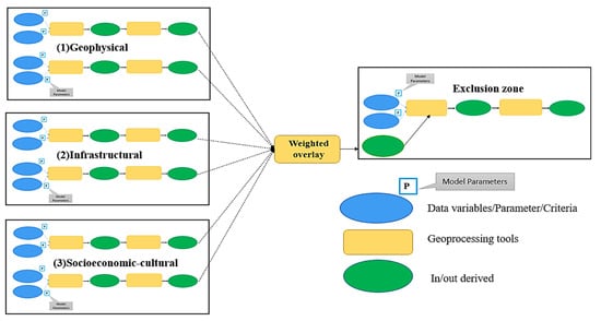 Figure 3 presents the conceptual framework of the model. The key components of the ModelBuilder tools include geoprocessing tools, variables, connectors, and exclusion zone, all designed to automate and document the spatial analysis and data management procedures. Within the ModelBuilder environment, users can create, visualize, and refine geoprocessing models through diagrammatic workflows. These diagrams illustrate the sequential linkages between processes and geoprocessing tools, where the output of one operation serves as the input for the next.