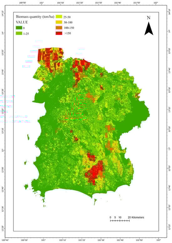 All criteria and sub-criteria were converted from vector to 100 m raster grids to enable uniform spatial analysis. While this standardization supports consistent computation, it may introduce minor data loss or aggregation bias. The model assessed land suitability, prioritized criteria, and estimated crop residue potential using 2019–2020 land-use data for Thailand’s Eastern Economic Corridor (EEC) from the Land Development Department (LDD, 2020) [20], combined with crop-specific residue-to-product ratio (RPR) values. The RPR, defined as the weight of residues remaining after harvest or agro-processing relative to the main crop product (e.g., husk and straw from rice), was used to quantify biomass availability [23].