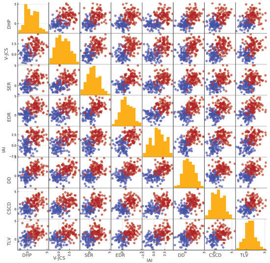 Scatter matrix of the eight extracted features used for classification. Clear clustering of islanded and grid-connected samples demonstrates the high separability achieved through robust feature engineering.