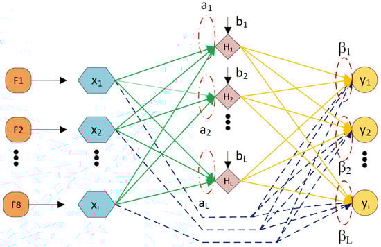 where denotes a nonlinear activation function (e.g., Gaussian RBF), and are randomly generated parameters defining the hidden nodes. The output weights are learned from data.