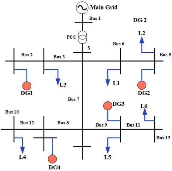 To ensure a realistic and practically relevant simulation environment, the microgrid model is based on the IEEE 13-bus distribution system, as illustrated in Figure 4. The network has been augmented with various distributed energy resources (DERs) and representative load types to reflect actual microgrid operating conditions. Table 2 outlines the critical parameters, including bus locations, generation unit types, load categories, and power ratings.