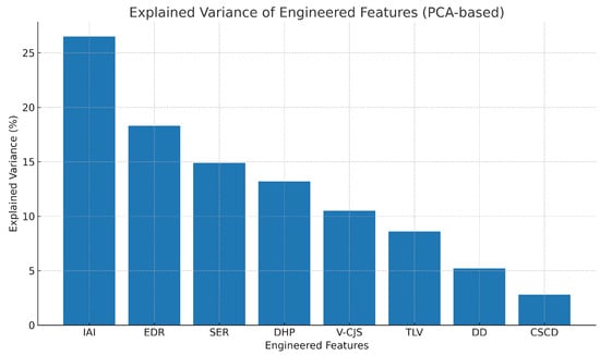 Figure 6 presents the PCA-based bar plot illustrating the proportion of variance explained by each of the eight engineered features employed in the proposed islanding detection framework. Unlike conventional representations that rely on abstract principal components (PC1–PC8), the variance contribution is directly mapped to the corresponding physical features to enhance interpretability and domain relevance.