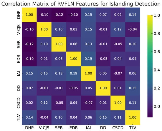 Figure 7 presents the Pearson correlation matrix for the selected features. The matrix visually represents the pairwise linear relationships, aiding in the detection of potential redundancy or multicollinearity within the feature space. The majority of features show relatively low to moderate correlation, suggesting that each captures distinct information relevant to the classification task. This diversity in signal representation helps improve the generalization ability of the RVFLN-based islanding detection model.