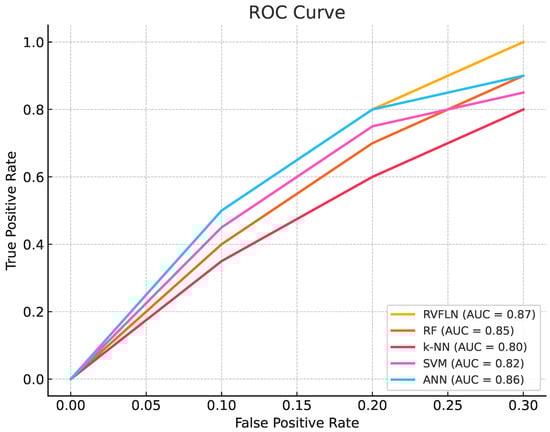 Compared with benchmark machine learning models, RVFLN achieves superior sensitivity and specificity. For instance, while Random Forest (AUC = 0.85) and k-NN (AUC = 0.80) demonstrate competitive results, RVFLN’s curve remains closer to the ideal top-left corner, particularly in critical scenarios such as grid-connected operation and islanding at the Point of Common Coupling (PCC), reflecting its ability to detect islanding events with minimal false alarms. Even in more challenging scenarios—such as multi-converter synchronous islanding and excess generation—RVFLN maintains consistent AUC values, underscoring its robustness under diverse operating conditions.