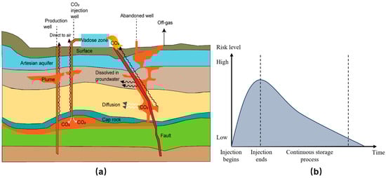 (a) Conceptual diagram of potential leakage path of CCUS, modified from Zhang et al. [28]. (b) Conceptual diagram of the risk of CO2 sequestration and leakage in geological media, modified according to Gholami R et al. [29].