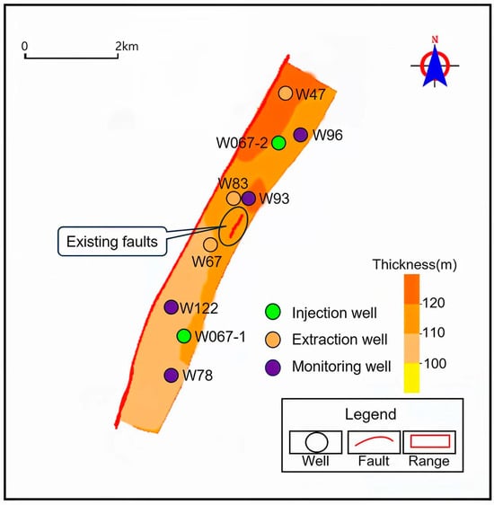 There are two injection wells (W067-1 and W067-2) and three production wells (W47, W83, W67) located in the study area, as shown in Figure 2. The results of the cementing quality survey showed that there are 14 existing old wells, 10 wells that qualified for the pressure test, 2 wells that have no cementing quality test data and 2 wells that are unqualified (as shown in Table 4). All of the wells are now in a normal working condition, except for W122, which was abandoned in 2007.