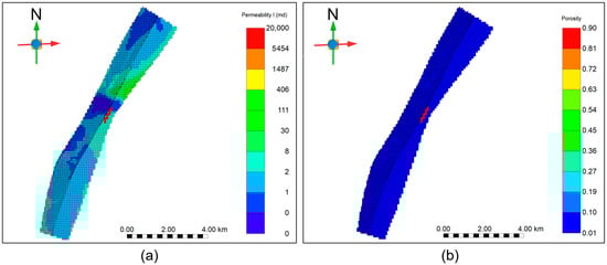 The permeability distribution of the numerical model relies on logging permeability data, and it was analyzed and calculated for different areas using well test data. The porosity distribution was derived from the logging porosity data and was analyzed using the sequential Gaussian simulation algorithm. The specific spatial distributions of the permeability and porosity are shown in Figure 3.