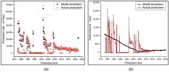 Model production rate and pressure fit for well W47. ((a) is W47 production rate validation results; (b) is W47 head pressure validation results).