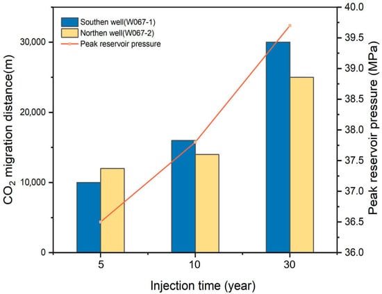 The permeability distribution of the reservoir exhibits a distinct pattern of higher values in the eastern region compared to the western region, consequently leading to preferential eastward migration of injected CO2 (Figure 6). Figure 7 shows the CO2 migration distance at different times of gas injection. For phase I (injection rate: 100,000 m3/day, duration: 5 years), the analysis reveals that the maximum north–south migration distance of CO2 from the southern injection well reaches approximately 10,000 m, while the northern injection well demonstrates a greater migration extent of 12,000 m along the same orientation. Additionally, a discernible migration plume extending approximately 8000 m from the injection wells toward the eastern boundary is observed. After 10 years of continuous injection, the migration distances exhibit a progressive enlargement. The southern injection well shows a significant increase in north–south migration distance, reaching 16,000 m, whereas the northern counterpart reaches 14,000 m. The CO2 plume maintains its eastward migration tendency toward the boundary. Reaching 30 years of injection duration, both injection wells demonstrate extensive CO2 migration. The maximum north–south migration distances escalate to 30,000 m (southern well) and 25,000 m (northern well), respectively. Notably, the eastward migration distance from injection wells to the eastern boundary attains 10,000 m. The overall spatial distribution consistently manifests higher migration potential in the eastern sector relative to the western region, aligning with the inherent permeability characteristics of the reservoir.