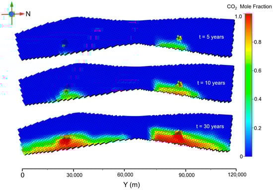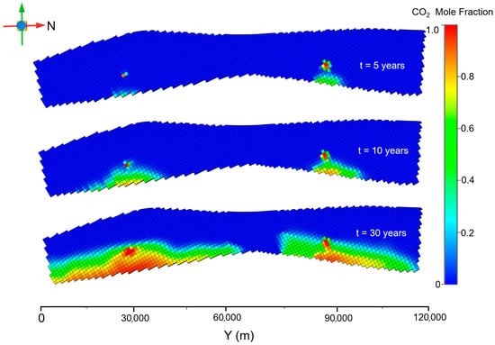 The CO2 distribution at the top of the reservoir in the fault leakage scenario is shown in Figure 11. After 5 years of gas injection, the total amount of injected gas is small, and the presence of new faults buffers the high-pressure area generated by the gas injection. The concentration of CO2 components decreases significantly in the area close to the new fault, presumably because the presence of the fault promotes gas migration to the surrounding grids and the upper caprock. After 30 years of gas injection, the CO2 content in the grid at the top of the reservoir near the injection well area increases significantly. The decrease in gas content in the fault grid indicates that this part of the gas has already diffused into the upper caprock, which increases the possibility of gas leakage from the cap layer.