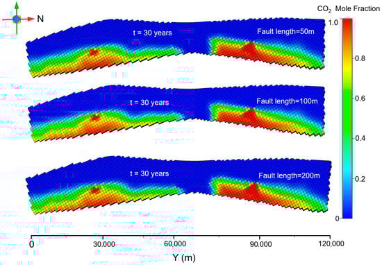 The CO2 distribution at the top of the reservoir in the caprock leakage scenario is shown in Figure 10. The maximum north–south migration distances demonstrate minimal variation from those under normal operating conditions. By comparing the simulation results, it is found that the damage to the caprock caused by faults has less influence on the distribution of CO2 gas in the reservoir. The spatial distribution of CO2 is basically the same as the normal working condition.