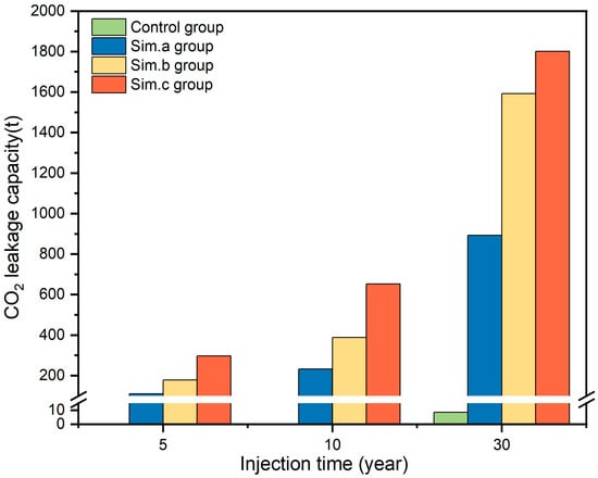 As shown in Figure 12, a more accurate quantitative assessment of the gas leakage is provided. During the 30 years injection period, the CO2 leakage in the experimental group is up to 160–320 times higher than that of the control group. It can be seen that the gas leakage increases sharply as the injection time increases, and the length of the flaw extending into the caprock also affects the leakage amount. When the fault destroys the entire caprock, the integrity and sealing of the cap layer will no longer exist.