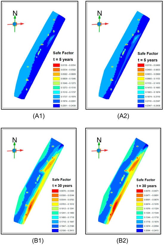 Map of safe factors for the study area at different injection times ((A1) is the safe factor spatial distribution at 5 years injection; (B1) is the safe factor spatial distribution at 30 years injection; (A2) and (B2) are the safe factor plots after superimposing the spatial distribution of CO2 mole fraction).