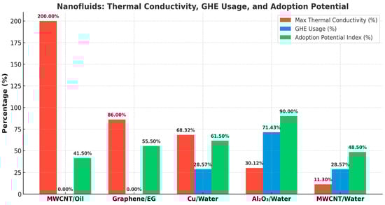 - Performance trends. Carbon-based nanofluids (e.g., MWCNT/Oil ~200%, Graphene/EG ~86%) exhibited the largest thermal-conductivity gains but saw limited GHE use due to cost, stability, and compatibility constraints. In contrast, Al2O3/Water (~30%) had the highest field adoption (~71.43%) because it balanced enhancement with stability, chemical compatibility, and cost.
