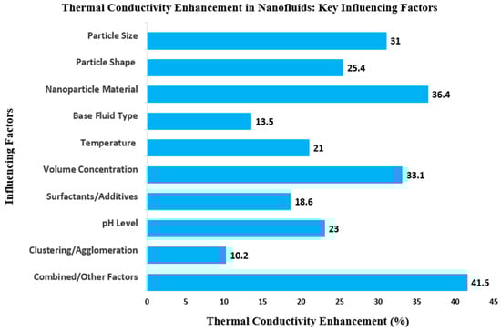 | Volume Concentration | Thermal conductivity improves significantly with volume concentration up to 4–5 vol.%, beyond which agglomeration occurs; e.g., 2 vol.% CuO → ~48% enhancement; 5 vol.% Al2O3 → ~30% increase; above 6 vol.% → decline or plateau observed. | Al2O3, CuO, ZnO, GO/Water, EG | 3 vol.% ZnO: ~41% gain; 6 vol.% GO → saturation; >7 vol.% → sedimentation | Manoj et al. [198], Zeinab et al. [223], Huaqing et al. [209] |