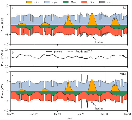 - For the selected day, the corresponding normalized profiles were loaded, including electricity prices , thermal load demand , electrical load , and feed-in tariffs .
