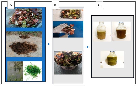 Procedure for sampling and preparing different types of waste: (A) collection, (B) processing, and (C) final samples.