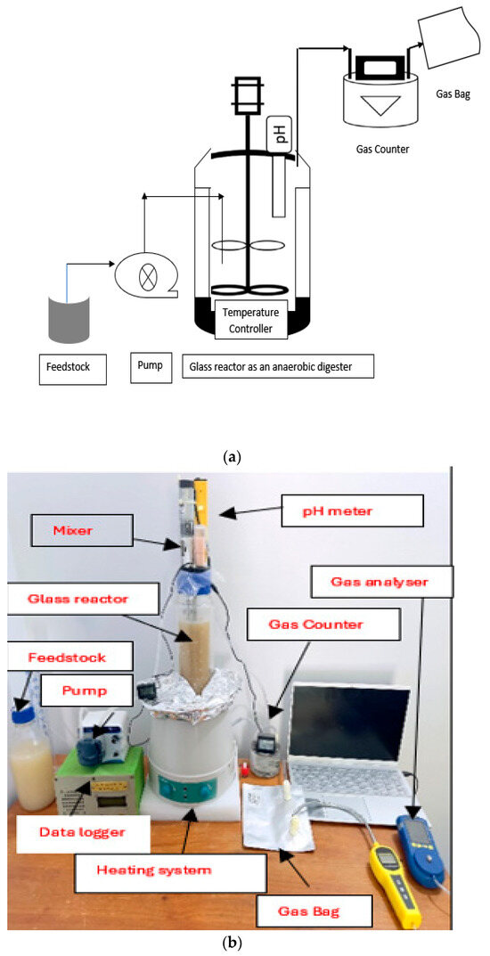 (a) Schematic diagram and (b) actual photograph of the anaerobic digester setup used in this study.