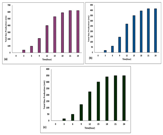 The gas production profiles for (a) FW, (b) cow dung and FW, and (c) green waste, cow dung, and FW over 24 h time interval.