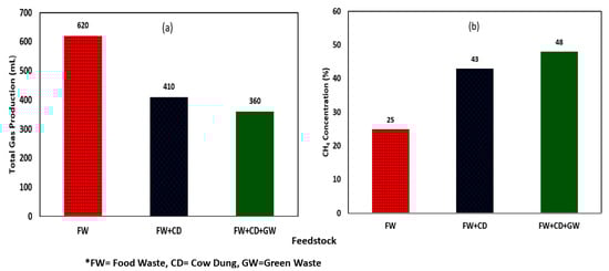 The (a) cumulative gas production and (b) average methane concentration profiles for FW, cow dung and FW, and green waste, cow dung, and FW over 24 h time interval.