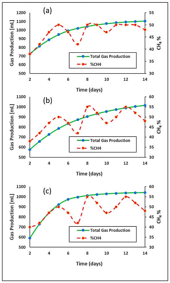 The cumulative gas production and average methane concentration profiles for (a) FW, (b) cow dung and FW, and (c) green waste, cow dung, and FW over 14-day time interval.