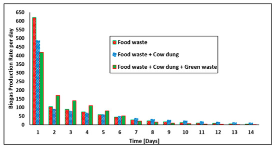 Figure 6 shows the daily biogas production rate over a 14-day period, which presents a marked decrease in production rates after initial peaks. Initially, the biogas output is significantly high, suggesting the effective initiation of AD processes. However, there is a steep decline in production as the days progress, stabilizing at much lower levels towards the end of the period. This trend is consistent with the findings of [25], who observed a rapid onset of microbial activity leading to an initial surge in biogas production, followed by a decline as substrate availability decreased and microbial activity stabilized [25].