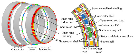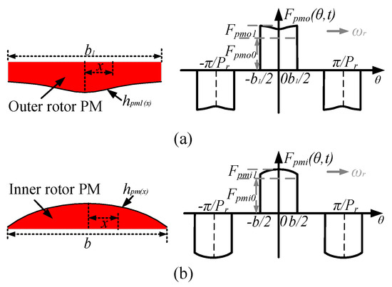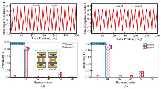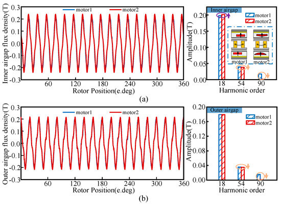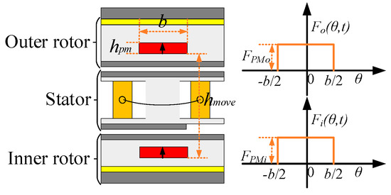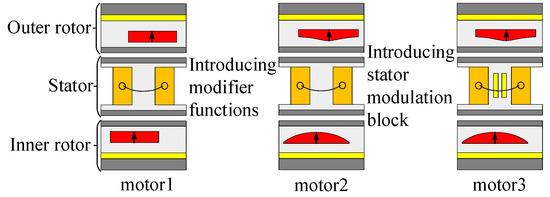 - Xiang, Z.X.; Zhou, Y.T.; Zhu, X.Y.; Quan, L.; Fan, D.Y.; Liu, Q. Research on Characteristic Airgap Harmonics of a Double-Rotor Flux-Modulated PM Motor Based on Harmonic Dimensionality Reduction. IEEE Trans. Transp. Electrif. 2024, 10, 5750–5761. [Google Scholar] [CrossRef]