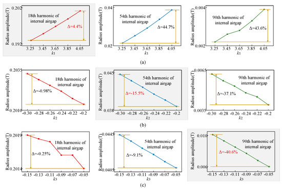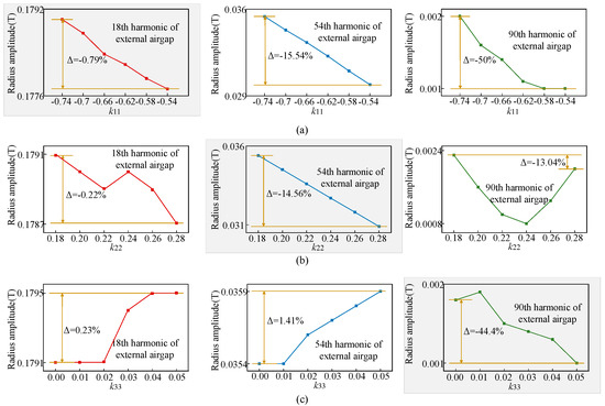 - The HI design adopted by the PM is different from the traditional harmonic suppression approach, achieving the dual goals of high-order harmonic suppression and 18th harmonic enhancement through directional regulation. The proposed HI ratio coefficient provides a quantitative basis for the magnetic field design of the PM. In addition, the modulator design actively introduces new harmonics and enhances the amplitude of the 18th harmonic, forming a synergistic modulation with the PM, breaking through the limitations of optimizing the modulator or PM topology separately in existing research and significantly improving the coupling efficiency with the armature magnetic field.
