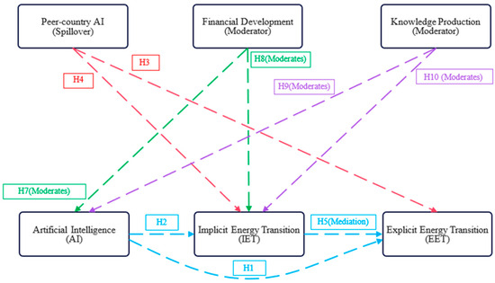 Harnessing the power of artificial intelligence, our study presents a bold roadmap for how “smart minds” reshape BRICS energy futures. Below are the nine targeted hypotheses (see Figure 1) that unpack AI’s direct, spillover, mediating, and moderating roles in driving both visible and efficiency-based energy transitions.