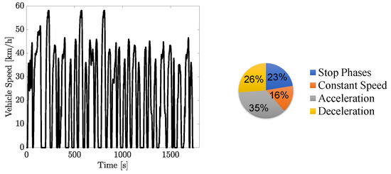 In order to evaluate the performance of the proposed solutions, the Braunschweig driving cycle, which is commonly employed in certification programs and research projects [12], is adopted to represent urban bus operations. In fact, this cycle is characterized by a high share of stop phases (i.e., 23%), reflecting the frequent start-and-stop driving pattern typical of public transport (see Figure 1).