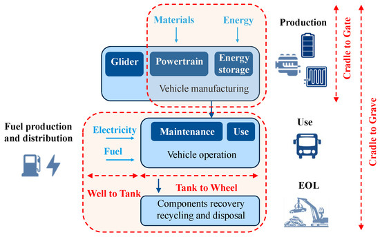 A comprehensive Cradle-to-Grave methodology is employed, covering all stages of the vehicle lifecycle, from production to EoL, with the system boundaries sketched in Figure 2.