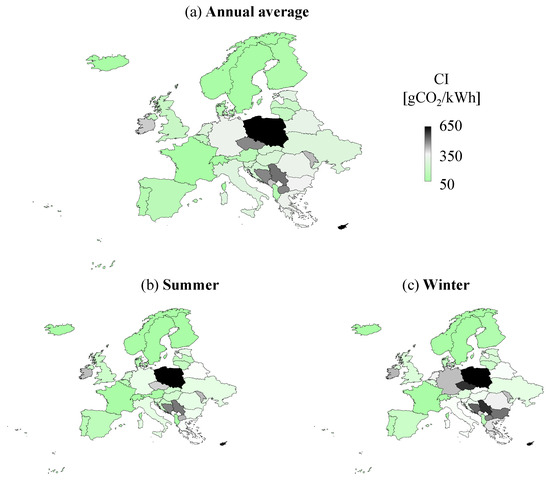 Input values of grid carbon intensity for electricity production in Europe, at present: (a) annual mean, (b) mean in summer, (c) mean in winter.