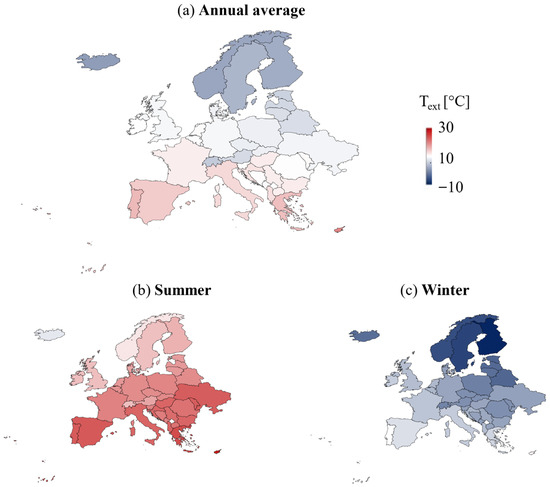 Input values of external temperatures in Europe: (a) annual mean, (b) mean in winter, (c) mean in summer.