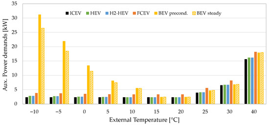 Auxiliaries’ power demand as a function of the external temperatures, for the considered powertrain architectures.