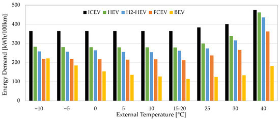 Finally, the BEV configuration shows the most pronounced energy savings, with an average reduction of 67% relative to the ICEV in the temperature range of 10 °C to 35 °C. Nevertheless, its performance declines under extreme conditions. At high temperatures, increased thermal management demands due to large battery capacity diminish its advantage, with an increase in BEV energy demand of 60% at 40 °C with respect to the one at an external temperature of 15/20 °C. On the contrary, at low ambient temperatures (<10 °C), the elevated energy requirements of the HVAC significantly impact overall efficiency, due to the lack of exhausted heat to be recovered for cabin heating in the BEV. At −10 °C, the BEV’s energy consumption advantage drops to 38% relative to the ICEV and becomes less efficient than the FCEV.