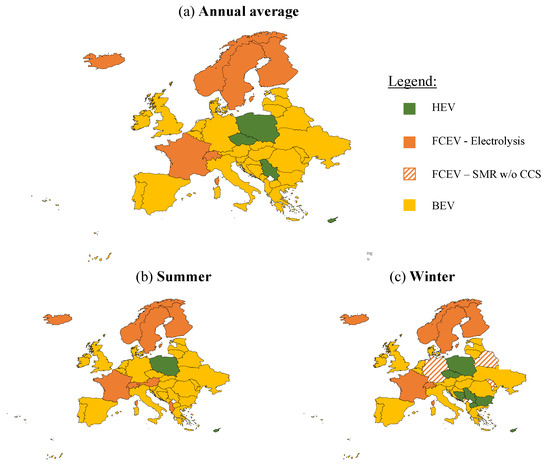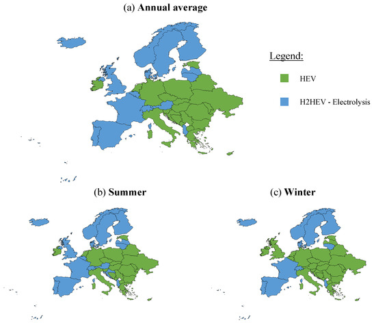 European map of the powertrain with lower CF depending on the grid CI and the considered average external temperature of each country: (a) mean annual, (b) mean summer, (c) mean winter.