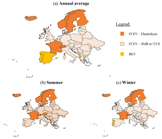 An additional hypothesis is presented in Figure 11, which follows the same layout as Figure 10, but with SMR combined with CCS technologies (with an overall process efficiency exceeding 60%) as a possible hydrogen production pathway. Notably, the integration of innovative CO2 capture technologies within the SMR process positions FCEVs as the most favorable option in terms of CF across Europe, while the BEV remains environmentally viable only in selected European countries. Specifically, FCEVs powered by “green” hydrogen retain the lowest CF only in countries where the CI is below 100 gCO2/kWh. In all other regions, FCEVs fueled by hydrogen from SMR with CCS represent the most advantageous choice, except for the Iberian Peninsula and Albania. In these countries, a temperate average annual climate and a grid CI around 100/150 gCO2/kWh make the BEV the option with lower CF. The pattern across European countries remains similar in summer (Figure 11b) and winter (Figure 11c), except in the previously mentioned countries, where BEV performance worsens due to more extreme external conditions. Further investigation is warranted to assess the impact of this technology on hydrogen fuel costs and its current level of technological maturity.