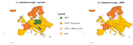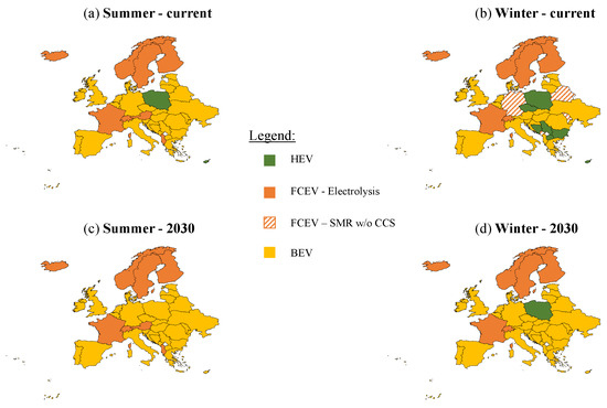 Finally, the results obtained for various European countries were extrapolated to a future scenario that assumes reduced CFs for battery manufacturing and hydrogen-related technologies, along with a projected decrease in the CI of electricity generation, as outlined in Section 2. Figure 13 presents a comparison between the current European context (taken from Figure 10a) and the anticipated situation in 2030 under these assumptions. The reduction in grid CI enhances the viability of BEVs in countries with moderately carbon-intensive grids and temperate climates, such as Germany, the Czech Republic, and those in the Balkan region. A similar case study was conducted in [51]. The results of the cited research indicate a lower CF for BEVs across most of Europe under the current scenario, with the exception of Poland, Estonia, the Czech Republic, and Bulgaria.