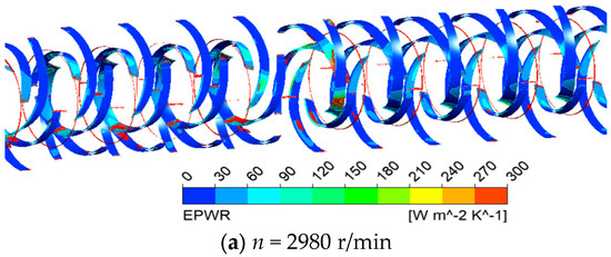 Figure 10 presents LEPWR distribution and LEPTR isosurfaces (EPTR = 10,000 W/m2/K). Figure 11 shows that when EPTR was 30,000 W/m2/K, the LEP reached the minimum at 4000 r/min, and the maximum at 5100 r/min. The LEP decreased from 2980 r/min to 4000 r/min, and gradually increased from 4000 r/min to 5100 r/min; it gradually increased at the outlet of the impeller, and mainly concentrated in the impeller flow channel. The LEPWR on the impeller blades mainly appeared in the backside near the inlet edge at 2980 r/min and 4000 r/min, while LEPTR was primarily located on the backside of the impeller blades; at speeds of 4800 r/min and running speed of 5100 r/min, the LEPWR mainly concentrated at the working surface near the outlet edge, with LEPTR primarily located at the impeller outlet.