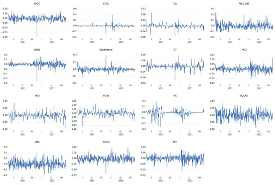 Emissions data for five sectors—power (POW), industry (IND), ground transportation (GT), domestic aviation (DA), and residential (RE)—were generated from the Carbon Monitor database between 1 January and 30 September 2022 (at https://eu.carbonmonitor.org/). Although Carbon Monitor provides a critical, regular dataset at the highest sustainability level, cross-sectoral distinctions in dimensional precision, as well as coverage lags, especially between residential and industrial sources, could influence the other CO2 emissions rates. Product emissions from point-source industrial and power sectors can be measured more accurately. Still, residential and transportation data are often estimated indirectly, resulting in greater uncertainty and discrepancies in sectoral emissions. Moreover, immediate or near-immediate data reporting communication latencies could introduce robust difficulties in continuous tracking, especially when faced with rapidly changing market and policy variables. This dataset provides a means to compare CO2-emission increases relative to some of the most significant global disruptions of the past few years, including COVID-19, post-pandemic recovery, and the RUW. To compare the RENE market’s outperformance, we utilize five RENE subindices (NOMXS, NOMXW, NOMXG, NOMXFC, and NOMXB) from Yahoo Finance [34,35,36]. This methodology is similar to those of previous studies, which have used indices such as the WilderHill Clean Energy Index and MSCI Global Green Bonds [37,38]. Conventional energy markets are represented by the following five fossil-fuel references, obtained from the EIA: WTI crude oil, New York Harbor conventional gasoline (HGG), uranium (URA), coal (COAL), and natural gas (GASN). For methodological reasons, price volatility is visible in market spikes. Table 1 and Figure 1 represent the data sources and trends, respectively. We measure performance via a volatility proxy, which can be described as follows:
