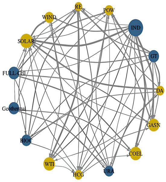 The network of volatility connectedness reflects the spillover effects between clean- and non-clean-energy markets and the carbon-emission industry, as shown in Figure 2. Nodes represent individual energy sectors or CO2-emitting sectors, with the node size proportional to total connectedness (TO + FROM). Edge thickness indicates the magnitude of directional spillover, derived from the GFEVD, which is represented by yellow for the net receivers and blue for the net transmitters. The node highlights key transmitters (larger nodes with thicker outgoing edges) and recipients (nodes with predominantly incoming edges), offering a visual representation of systemic risk flow in the energy-carbon system. Carbon Monitor is the most important transmitter of volatility shocks to other markets in the industry sector. In contrast, fuel cell, geothermal, bio, and uranium markets lead in driving volatility in the conventional energy market. In the United States, solar continues to be the most vulnerable to carbon-emission-related disruptions. The coal and WTI markets are also heavily impacted by shocks and pressures from clean energy and carbon emissions, primarily due to the COVID-19 pandemic and the military involvement in Ukraine. These findings suggest that the energy and carbon-emission markets are highly interdependent and that shocks in one market can have substantial spillover effects on the others. The finding that the industrial and power sectors are the strongest volatility transmitters is consistent with the US economy’s reliance on energy-intensive industries, particularly chemicals, steel, and manufacturing, which remain heavily dependent on fossil fuels. In contrast, wind and solar subsectors emerge as receivers of volatility, reflecting their rapid but policy-driven expansion under frameworks such as the Inflation Reduction Act (IRA). The high connectedness index (84%) underscores the systemic risk in the US energy system, where the absence of a nationwide carbon price and fragmented regulatory regimes amplify spillovers across sectors.