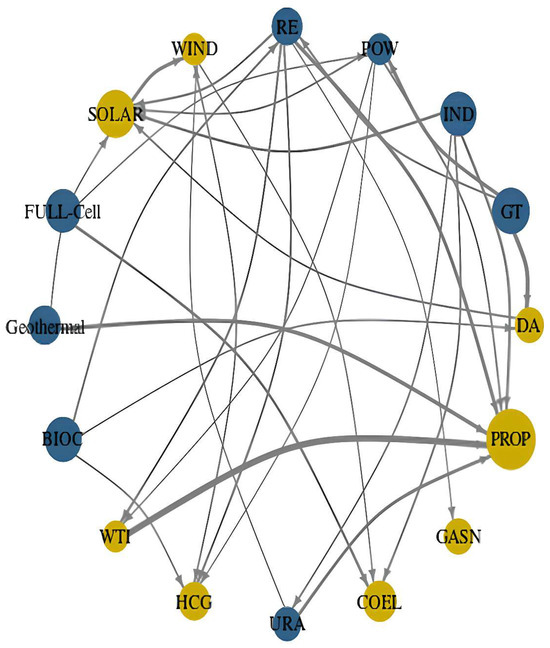 To determine the continued presence of previously identified sources and recipients of volatility within the initial group, it is crucial to analyze their functions when a subsequent dataset is introduced. The incorporation of a new time series, such as the Mont Belvieu propane data from Texas, into econometric or financial analyses has the potential to yield nuanced interpretations and necessitate adjustments to the study’s outcomes and theoretical foundations. The utilization of the MontBelvieu propane data, which represents a conventional energy variable, highlights the prominence of carbon metrics and specific RENE sources like geothermal and fuel cells, which serve as the primary channels for transmitting shocks. In contrast, propane primarily serves as a recipient of information in conjunction with traditional energy sources, corroborating previous findings, as shown in Figure 3. The robustness of the spillover patterns across alternative windows emphasizes that systemic risk transmission in US energy markets is structurally persistent. This persistence is linked to socio-economic realities such as the country’s high reliance on private vehicles and aviation for mobility, where fuel demand remains inelastic. These structural dependencies limit the extent to which short-term shocks can be absorbed, explaining why volatility spillovers remain elevated across specifications.